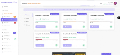 Esta seção da plataforma é muito boa, pois nos permite ganhar moedas extras e pontos de experiência por meio de conquistas na web. Por exemplo, "Complete 5 shortlinks", "Alcance o nível 10" ou visite a página todos os dias . Assim que as tarefas forem concluídas, basta clicar em "Solicitar" para receber sua recompensa.